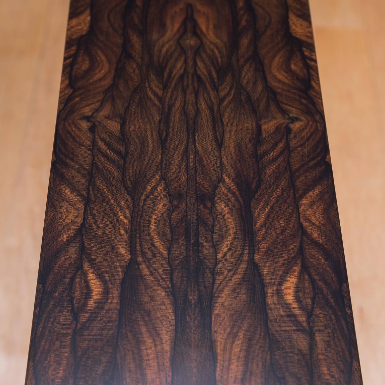 The contrasting dark veins and detailed lines make it striking. Many local modern furniture makes produce pieces from this wood. As the wood dries, it cracks extensively, we have cut away all those cracks (over of the boards) to produce these pieces. It is difficult to get good lengths like this in ziricote which is drie defect free and has good appearance.