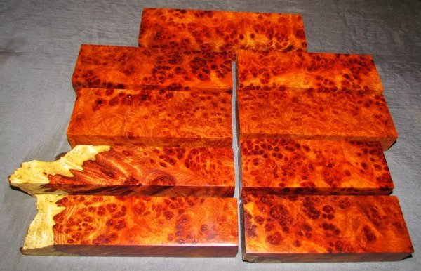 Very rare, no new stock of this quality is normally seen on the market. It comes from padauk trees ( Pterocarpus spp.) of Southeast Asia. Padauk trees are quite common but burl wood is rare.